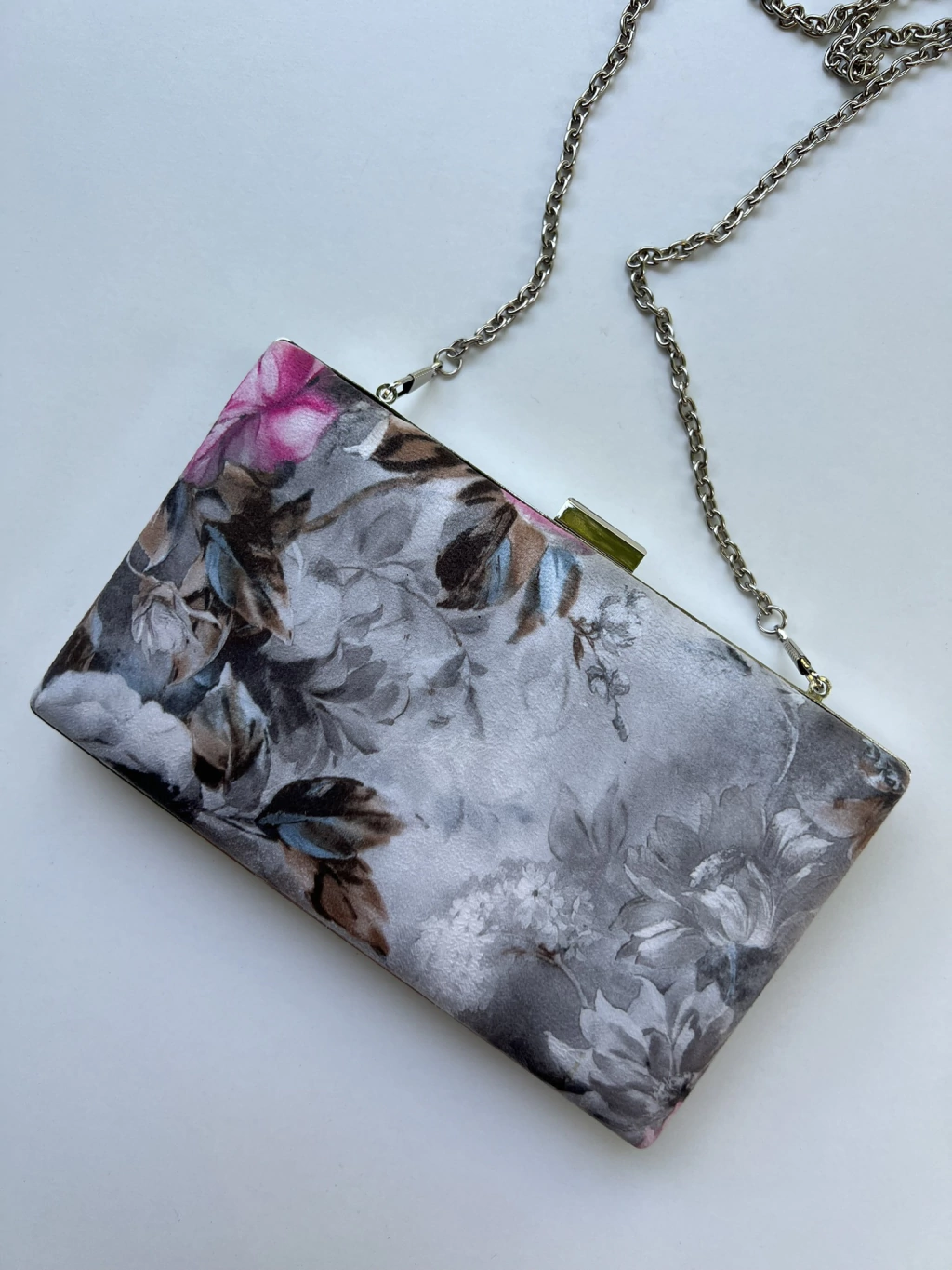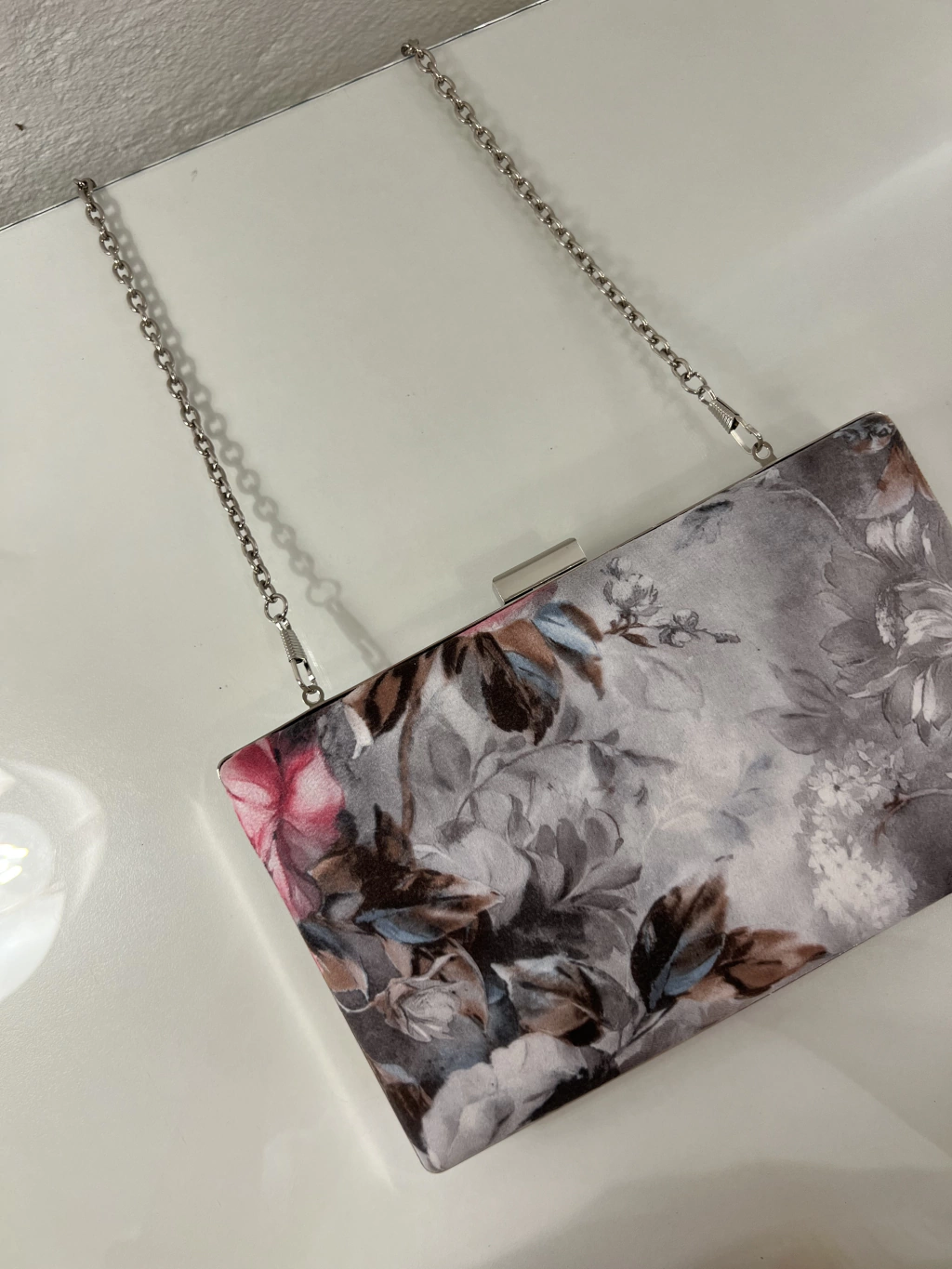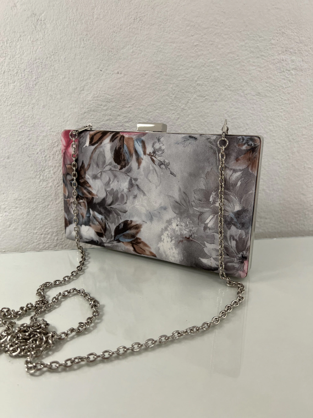 Este clutch parece sacado de una pintura, es muy hermoso y original. Su textura es similar al terciopelo. Tiene sus detalles en color plateado, con cadena desmontable por lo cual también podes usarlo como sobre