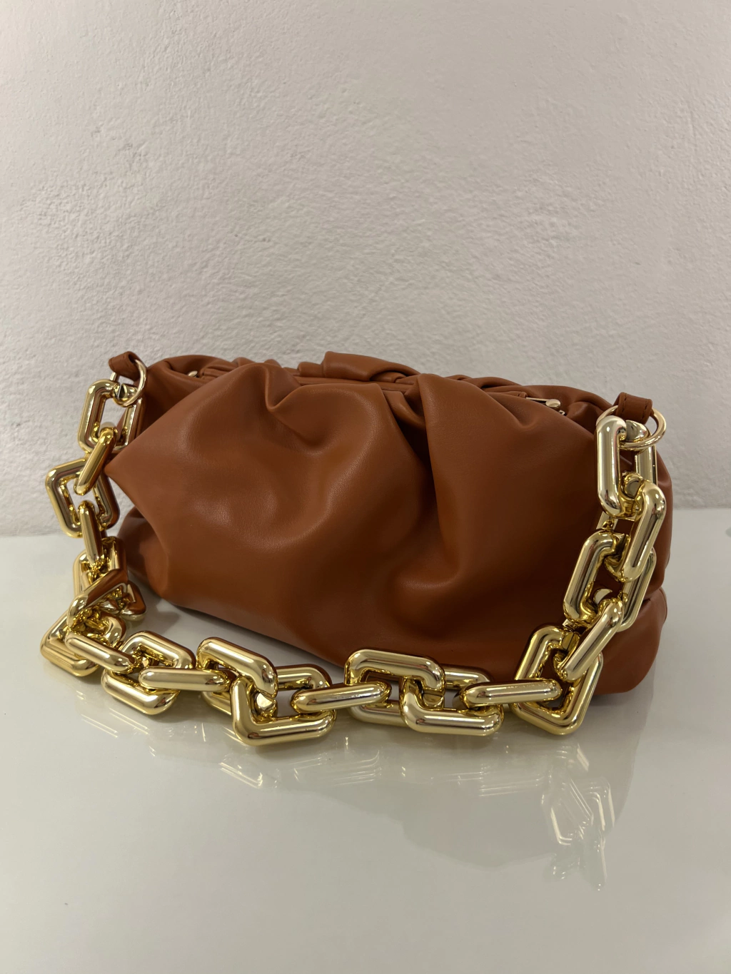 Esta Minibag está confeccionada en ecocuero color suela, tiene su detalle de cadena en color dorado lo cual la hace resaltar un montón!
